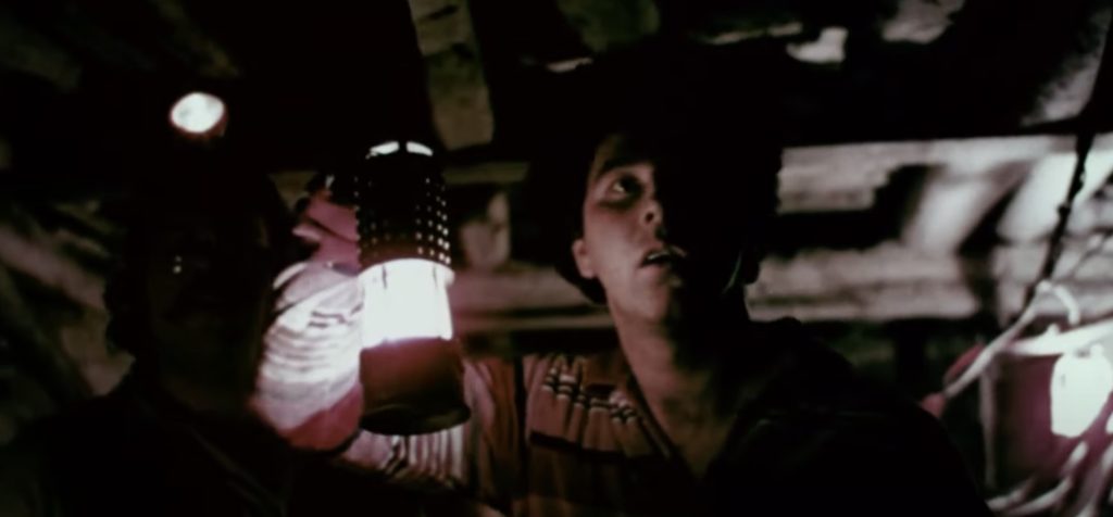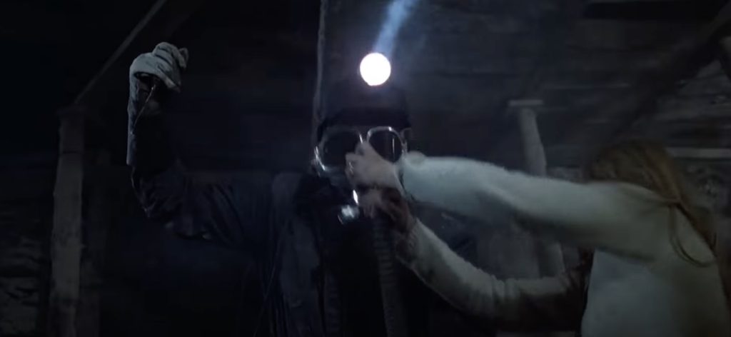 The Miner is following them, breaking the lightbulbs strung up. This is another great sequence by the audio effects team. The sound of the pickaxe hitting the bulbs combined with the pop as the explode as the tunnel grows darker, just works so well. The group hears the noise before they know what it is, adding to the tension.