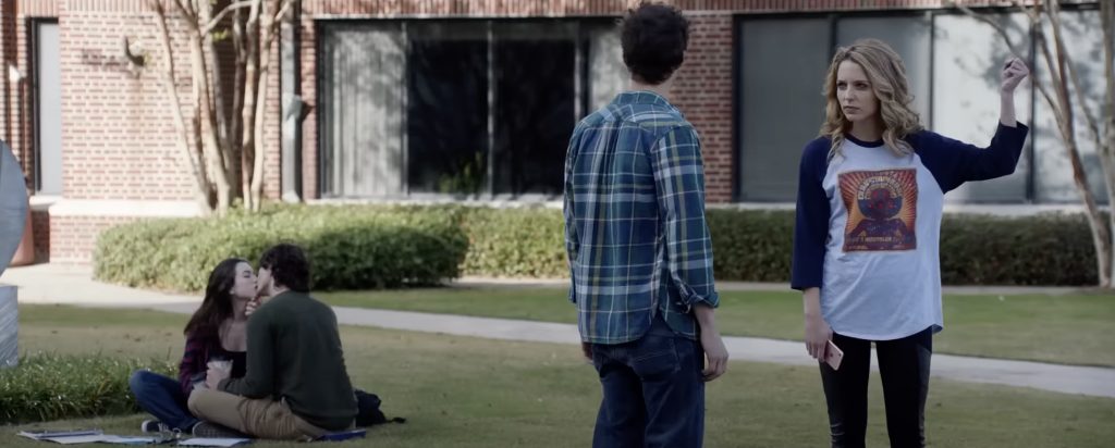 As it’s a looper first (but not Looper), as the Ghoul mentioned, the horror elements are rather mild. There’s some great tension as Tree makes her way through each iteration of the day, wondering where the killer is lurking each night. The killer’s getup is suitably creepy, using a fictional mascot mask for the Louisiana college where the movie is set (and seriously, fictional college, you should reconsider your mascot choices). While there is some minor blood spurting at times, the violence is really pretty tame. I’ve seen far worse on network television.