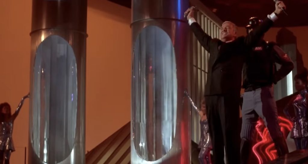 I want to talk about the movie on its own merits.  It may be hard to see them past the gold spandex jumpsuit and opera-singing killer, but they are there.  I have a fondness for dystopian sci-fi thrillers, especially ones that lean towards dark comedy. Robocop is one of my all-time favorite movies.